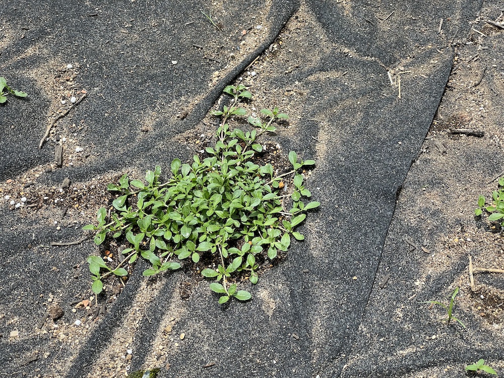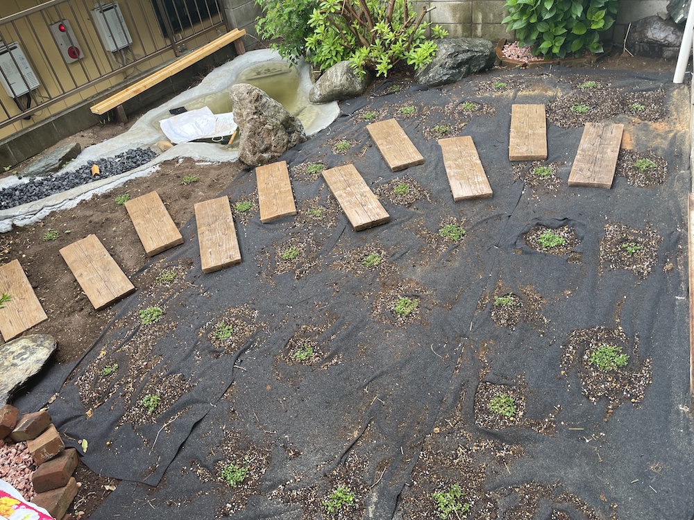 シートの上に上たクラピアは圧倒的に成長が早い、雑草がはえない